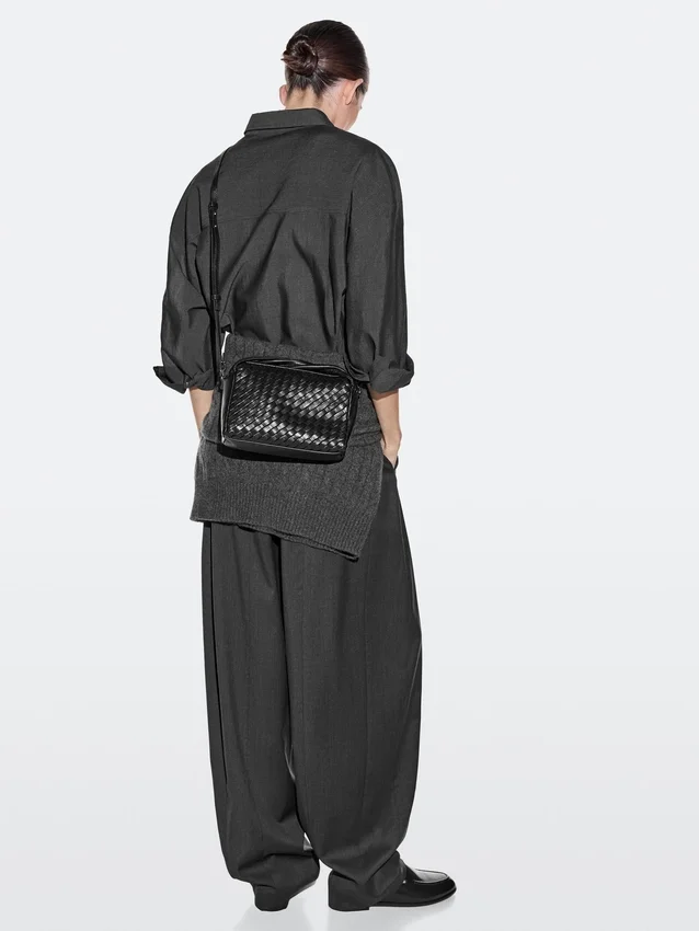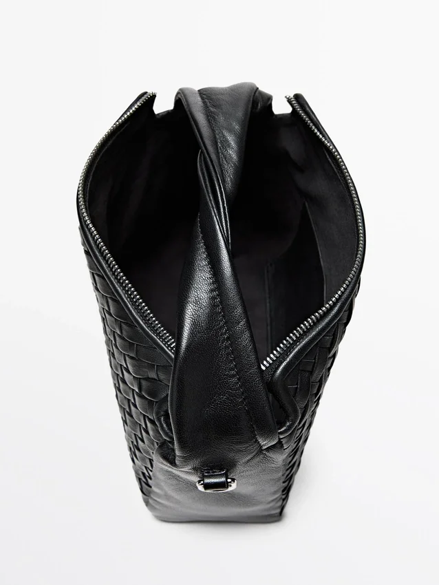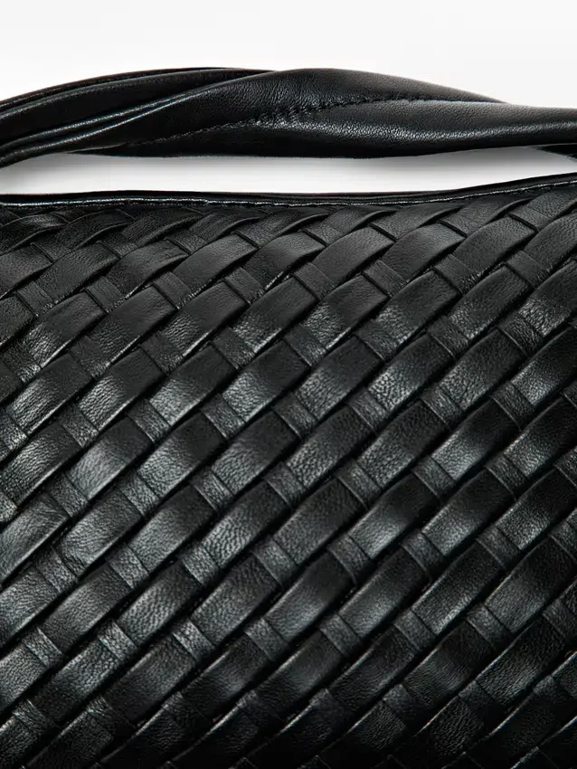 Väska tillverkad av fårskinn med nappa-finish. Justerbar och avtagbar axelrem. Flätad. Dragkedja. Handledsrem. En innerficka. Bomullsfoder.