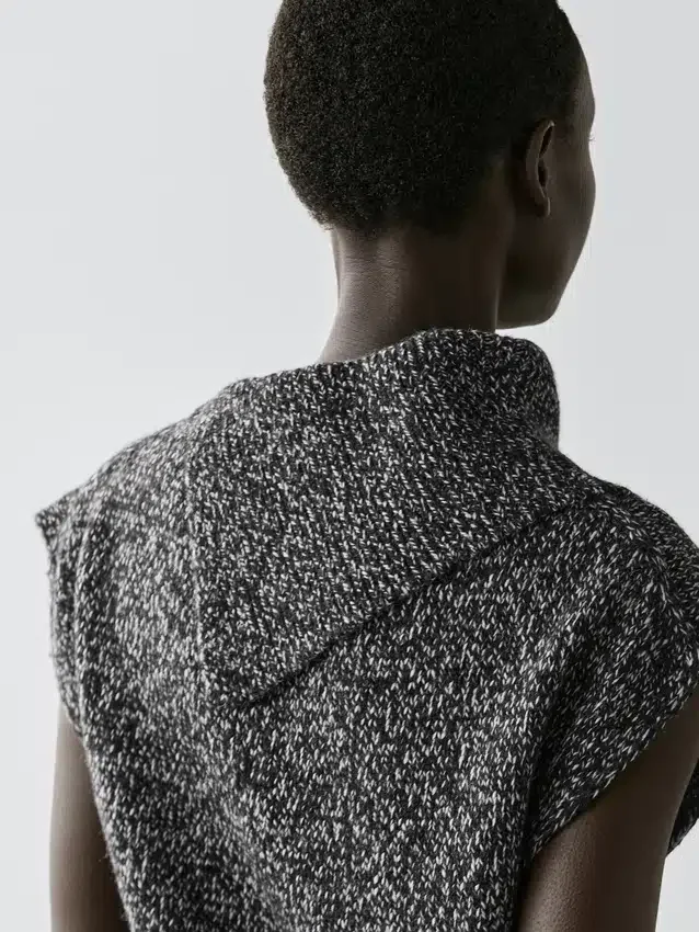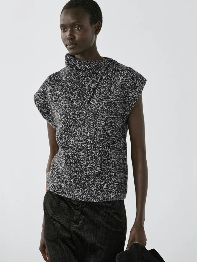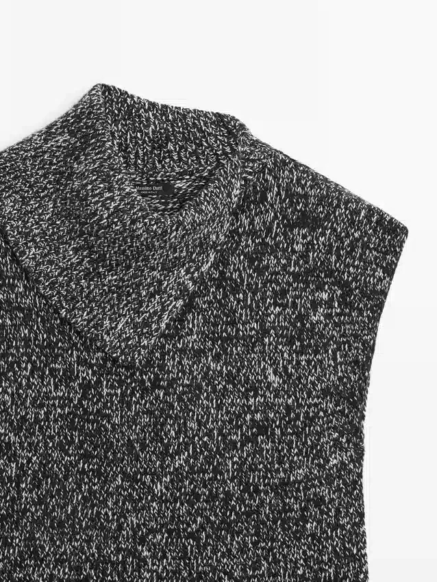 Stickad väst i ullblandning. Asymmetrisk nedvikt krage. Tillverkad i Moulina-garn som ger ett mycket karakteristiskt tvåfärgat utseende..