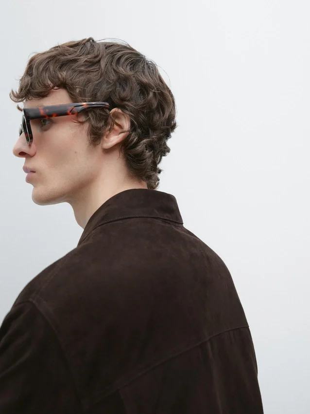 Jacka tillverkad av getskinn med mockafinish. Långa ärmar. Tvåvägsdragkedja dold av en knäppning med tryckknappar. Inre ficka med tryckknappar. Fickor med lock och tryckknappsstängning. Fodrad.