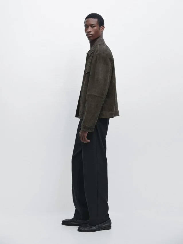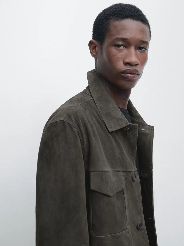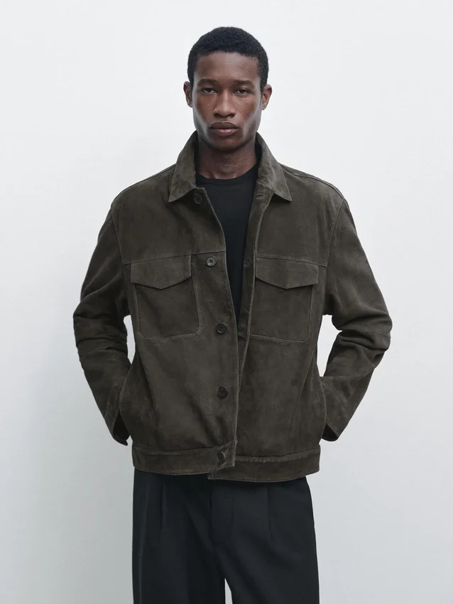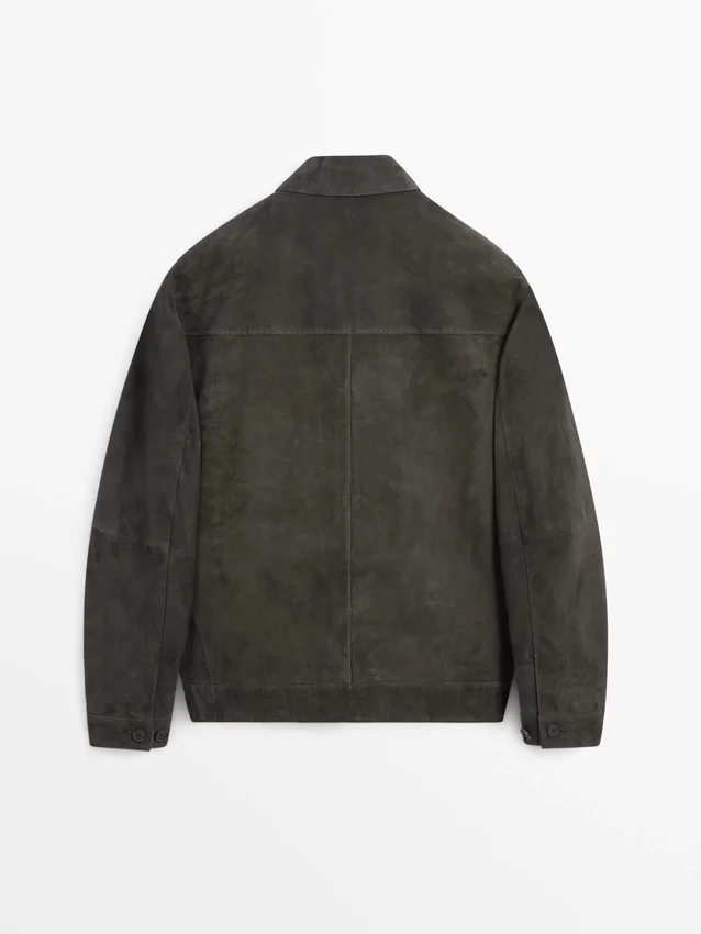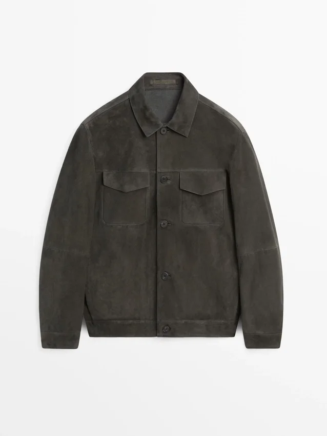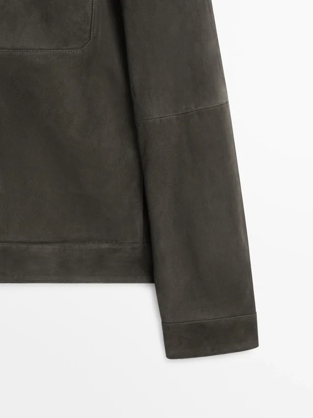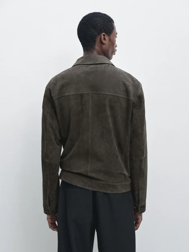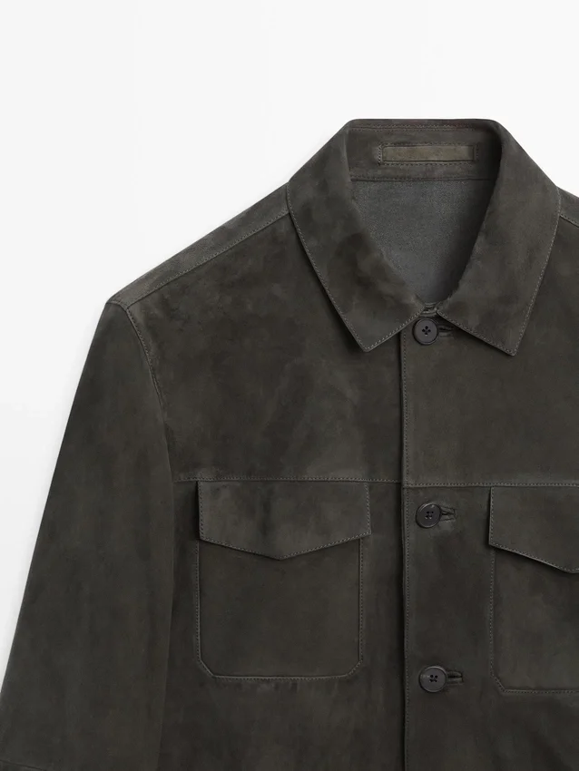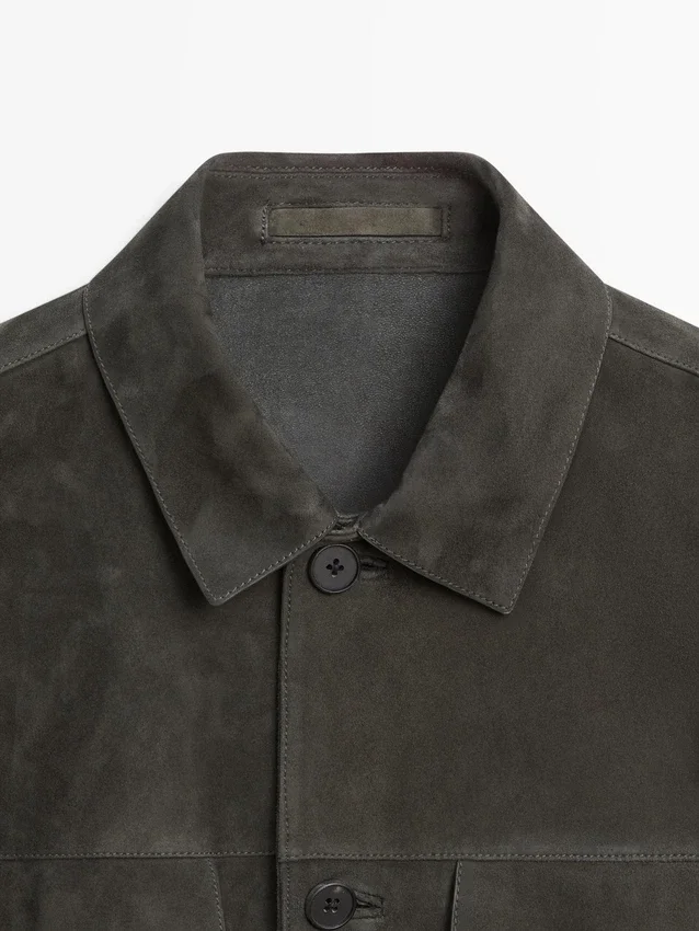Jacka tillverkad av getskinn. Långa ärmar med knäppta manschetter. Skjortkrage. Knäppning. Två sidfickor. Två påsydda fickor med lock på bröstet.