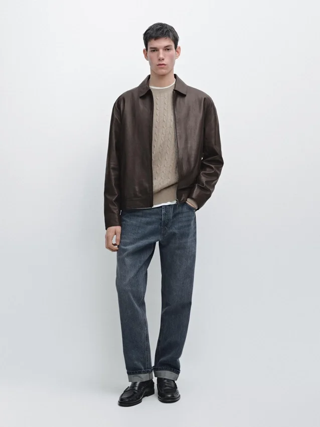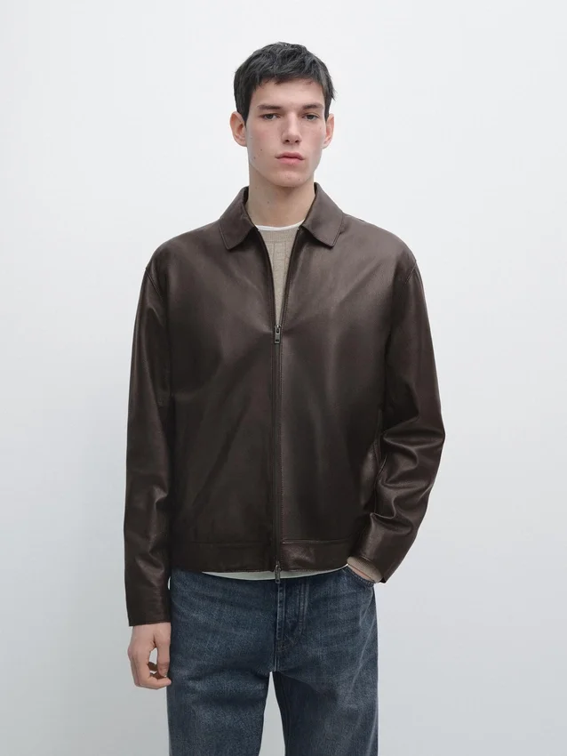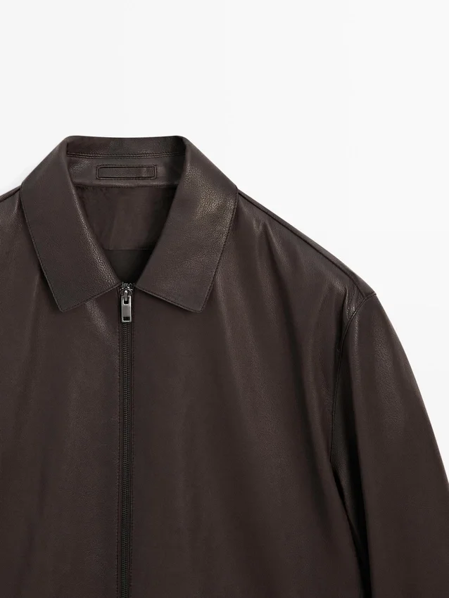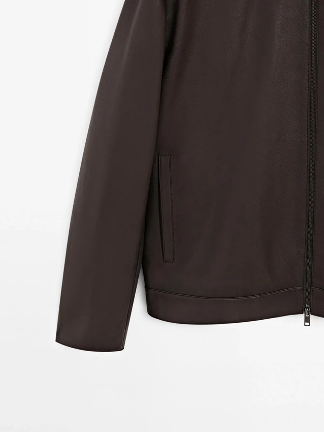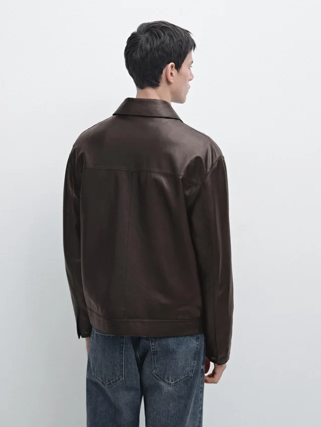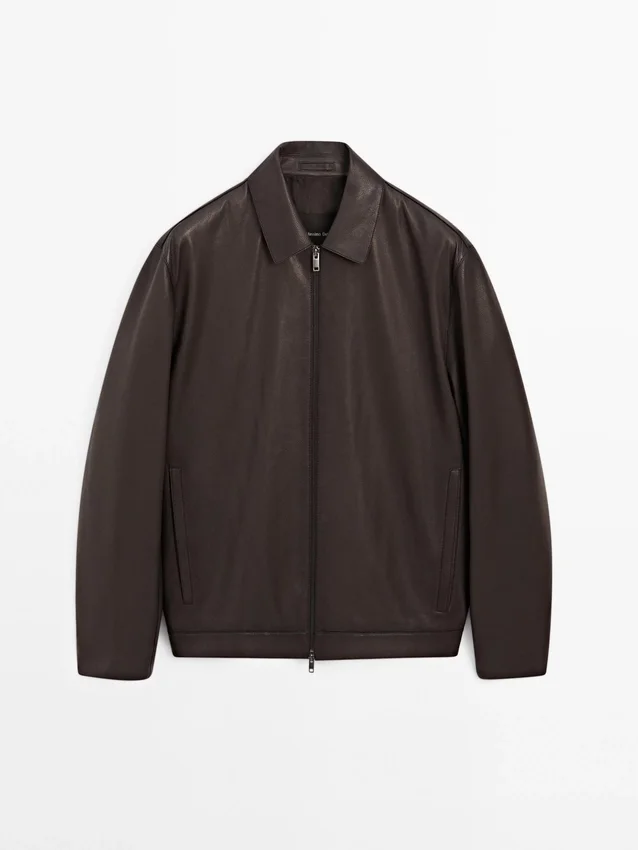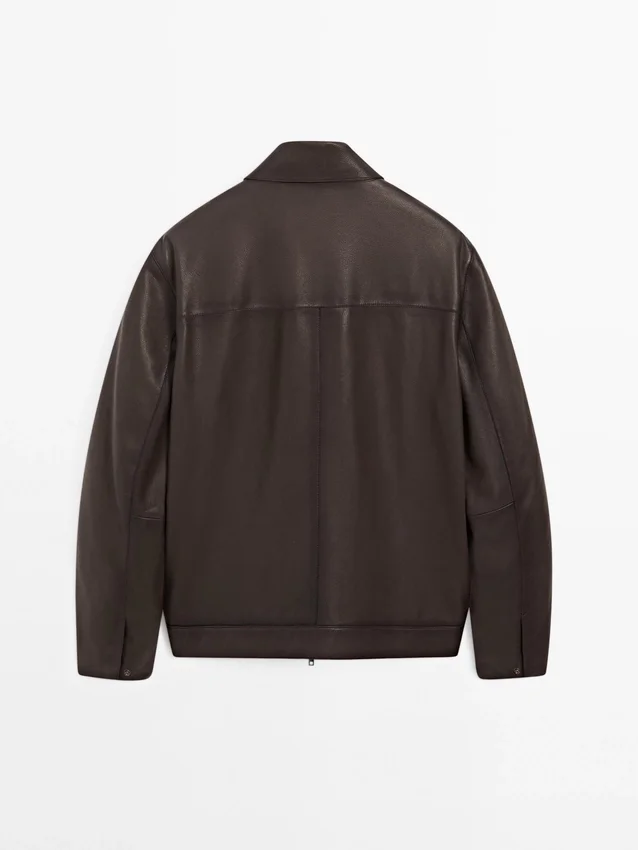 Jacka i fårskinn med nappa-finish. Skjortkrage. Långa ärmar med tryckknappsmanchetter. Tvåvägsdragkedja. Två sidfickor.