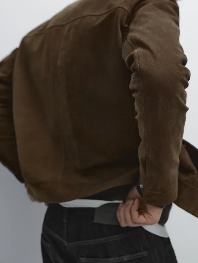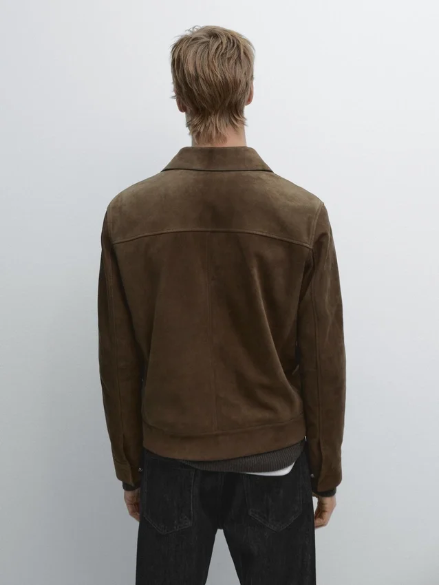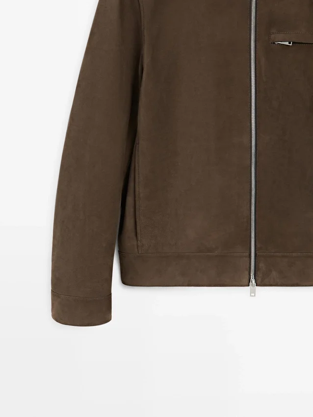 Jacka tillverkad av nötläder med nubuckfinish. Skjortkrage. Långa ärmar. Den har tvåvägsdragkedja. En bröstficka med dragkedja.