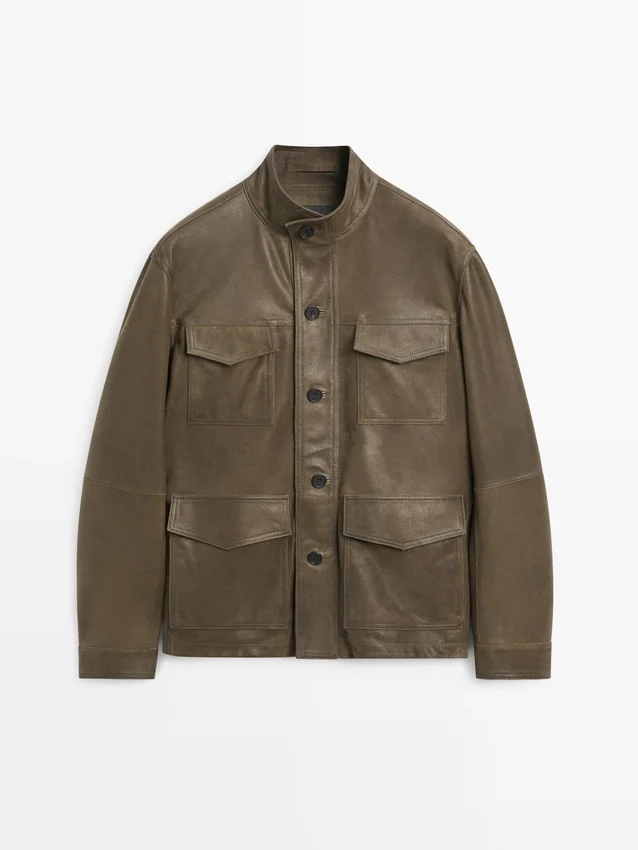 Jacka tillverkad av getskinn. Långa ärmar med knäppta manschetter. Knäppning fram. Hög krage. Fyra påsydda fickor med lock. Sömdetaljer. Sliten effekt.
