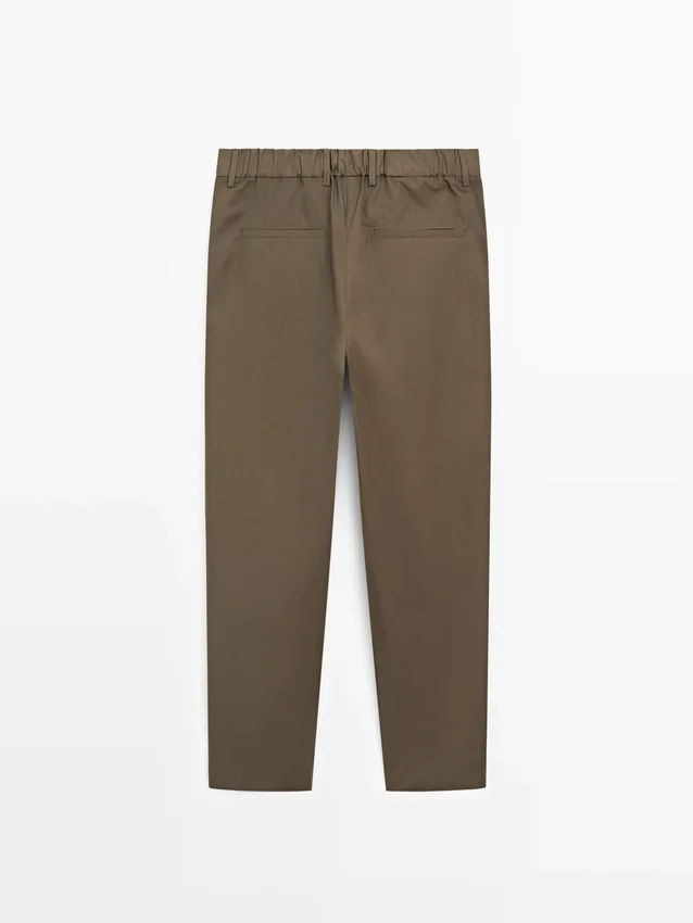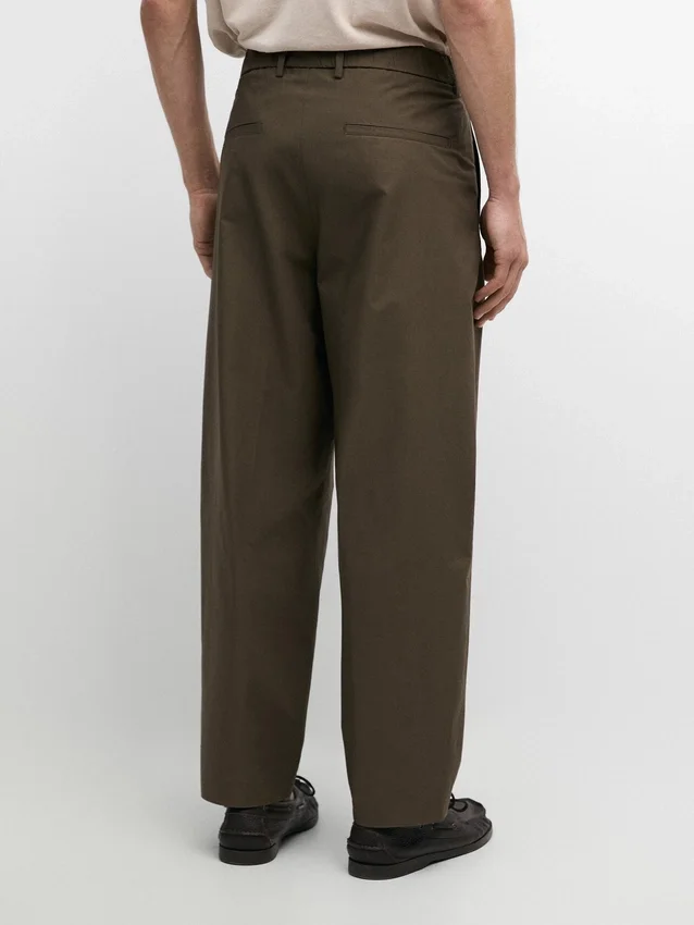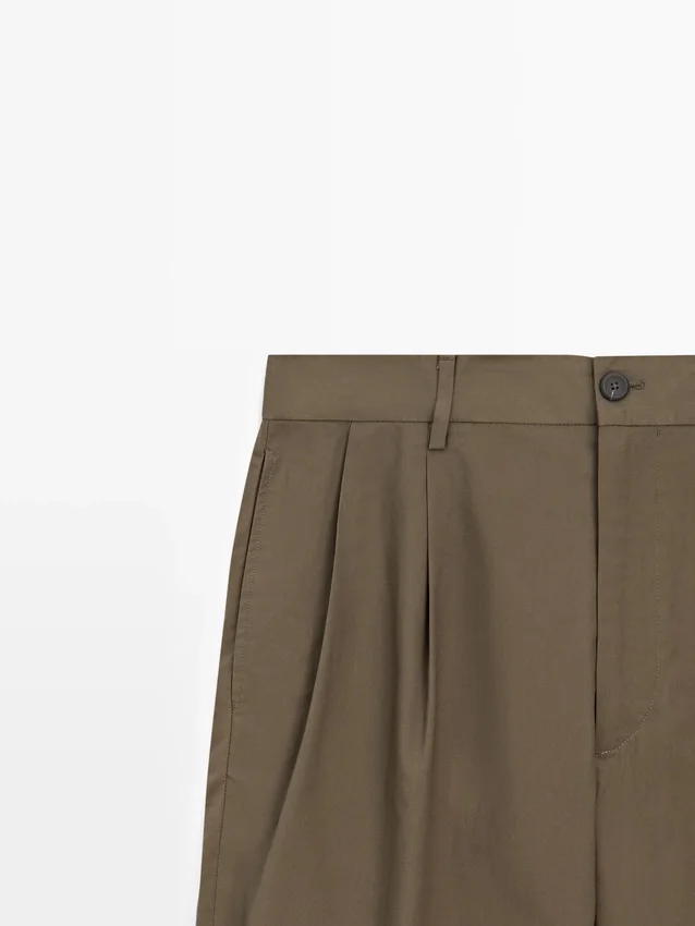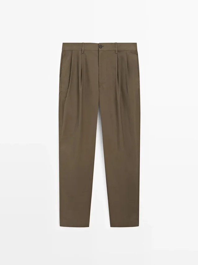 Byxor med veck. Bälteshällor. Dragkedja fram och knäppning upptill. Två sidfickor. Fodrad. Dubbla veck på framsidan.