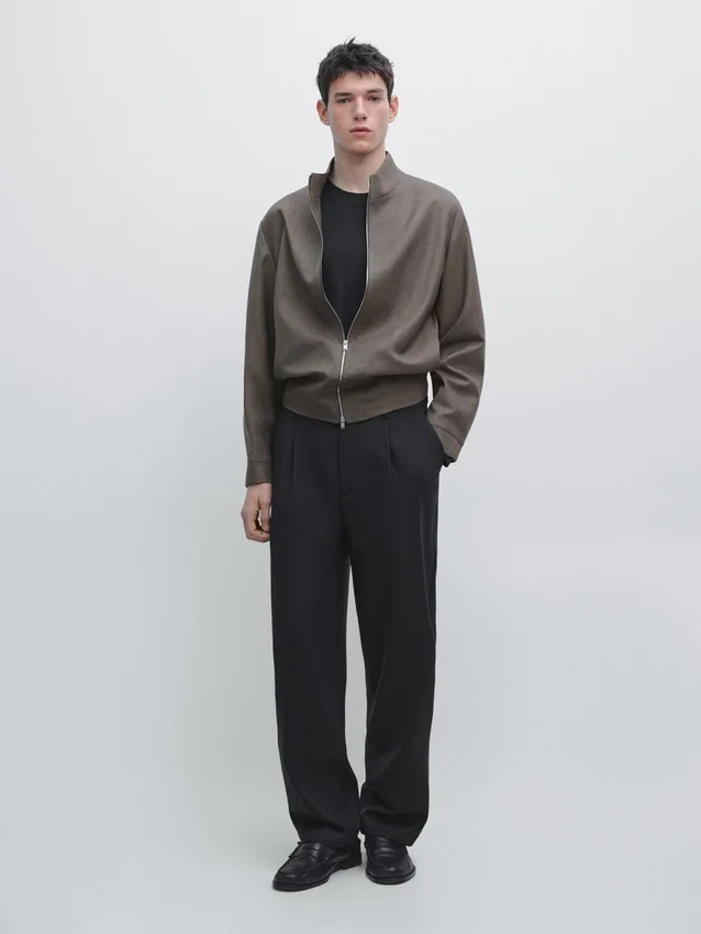 Byxor med avslappnad passform: Denna modell har en vid och ledig silhuett vid midjan, höfterna och benen. Skärp. Dragkedja dold bakom en knäppning, knapp och knäppt rem. Två sidfickor.