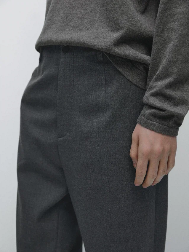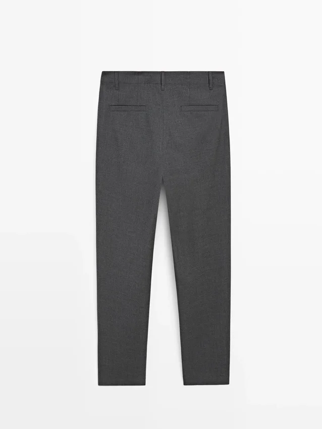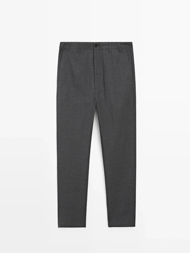 Byxor tillverkade av huvudtyg i ull. Dold dragkedja och hake-och-öga-knäppning. Två sidfickor.