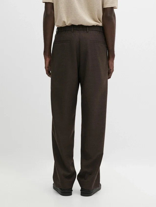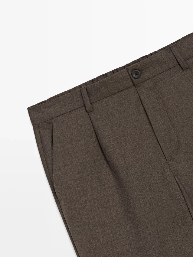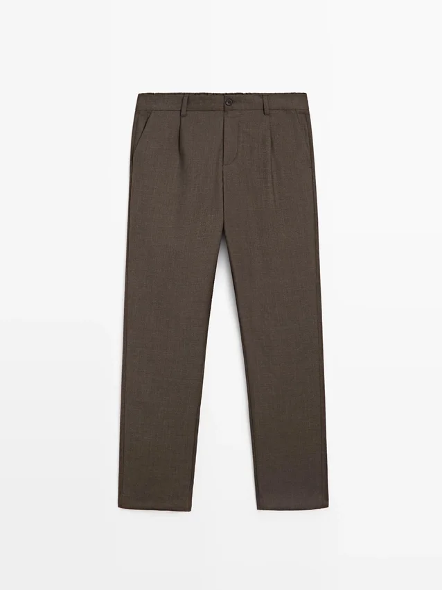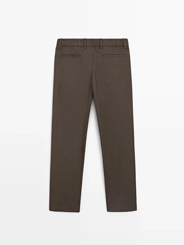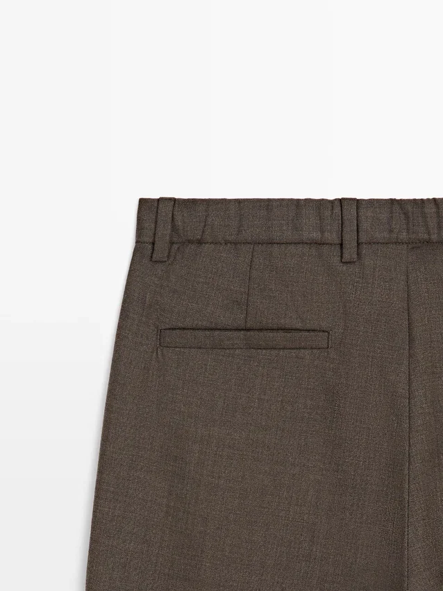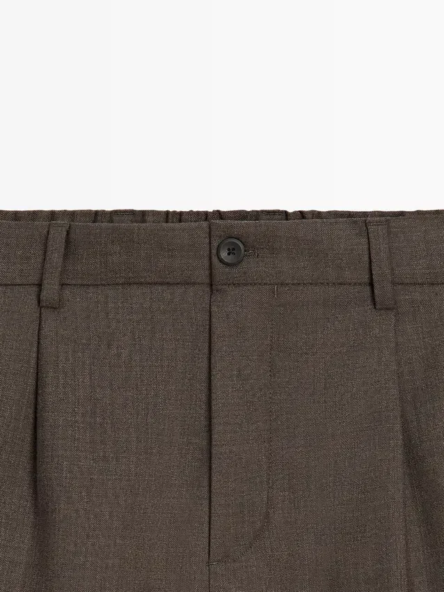 Byxor tillverkade av huvudtyg i ull. Elastisk midja baktill. Dragkedja dold av en knäppning, knapp och knäppt band. Två sidfickor. Insnitt på framsidan. Cool Wool: Lätt, andningsbart och skrynkelfritt tyg..