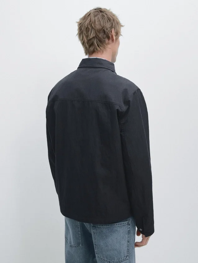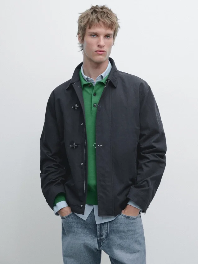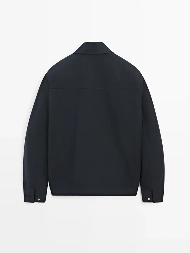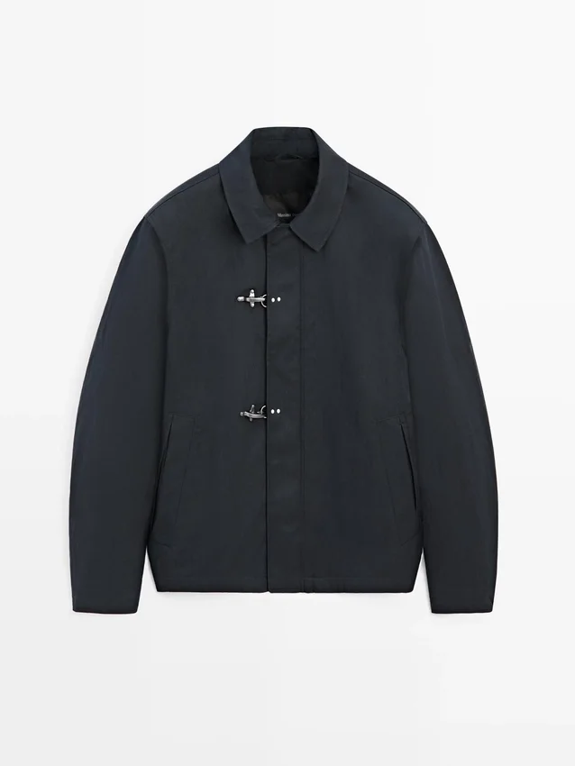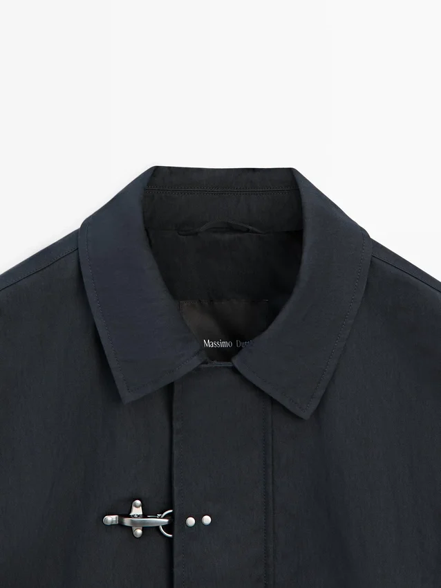 Jacka tillverkad av ett bomullsblandat tyg. Skjortkrage. Långa ärmar. Knäppning med knappar och snörning.