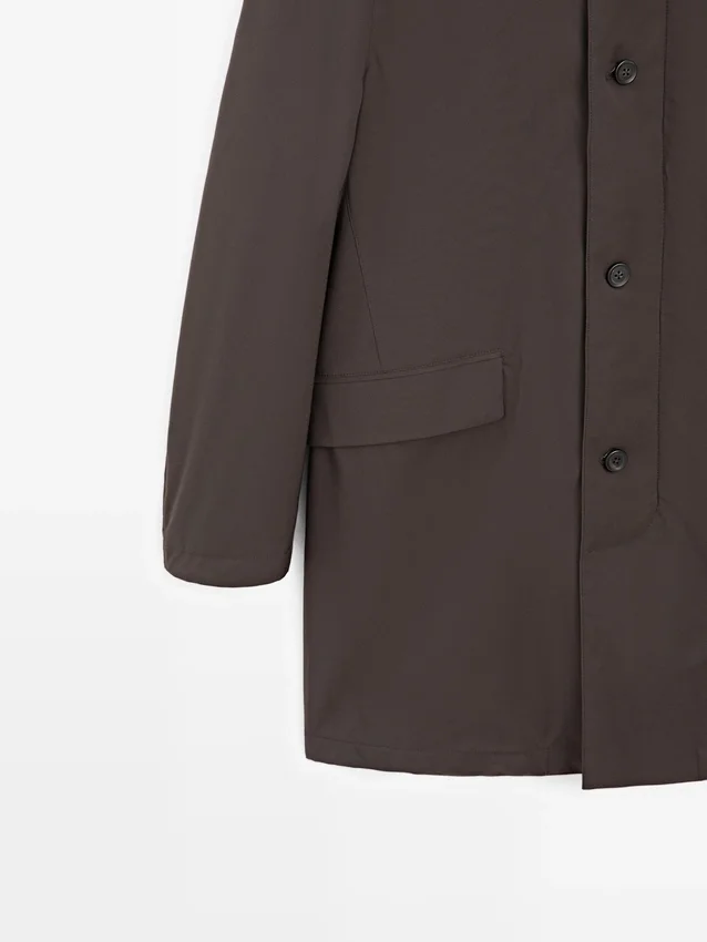 Quiltad jacka. Långa ärmar. Hög krage. Tvåvägsdragkedja fram dold av en knappslå. Två sidfickor. Fickor med lock och tryckknappsstängning. Innerficka med dragkedja. Öppning mitt bak med tryckknappsstängning. Detalj: Snabb och enkel låsmekanism, utformad för att ge ökad komfort. Vattenavvisande tyg.