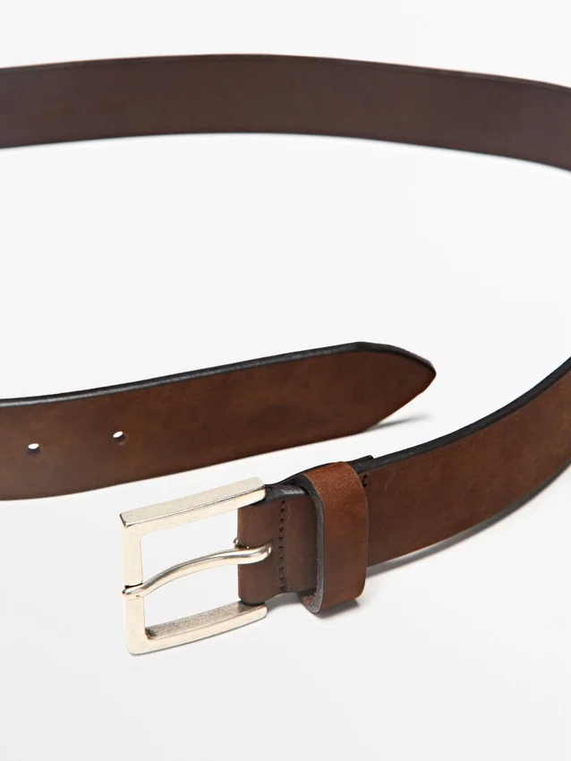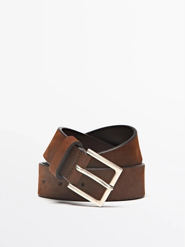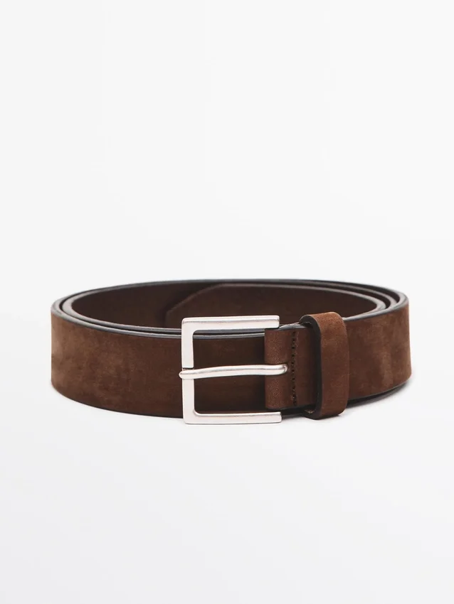 Skärp tillverkat av nötläder med nubuckfinish. 3,5 cm brett. Fyrkantigt metallspänne.