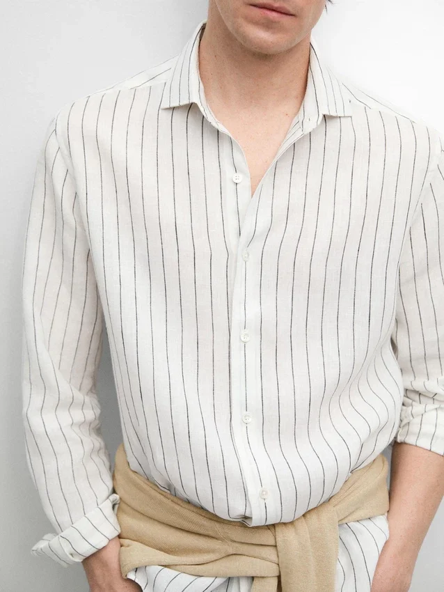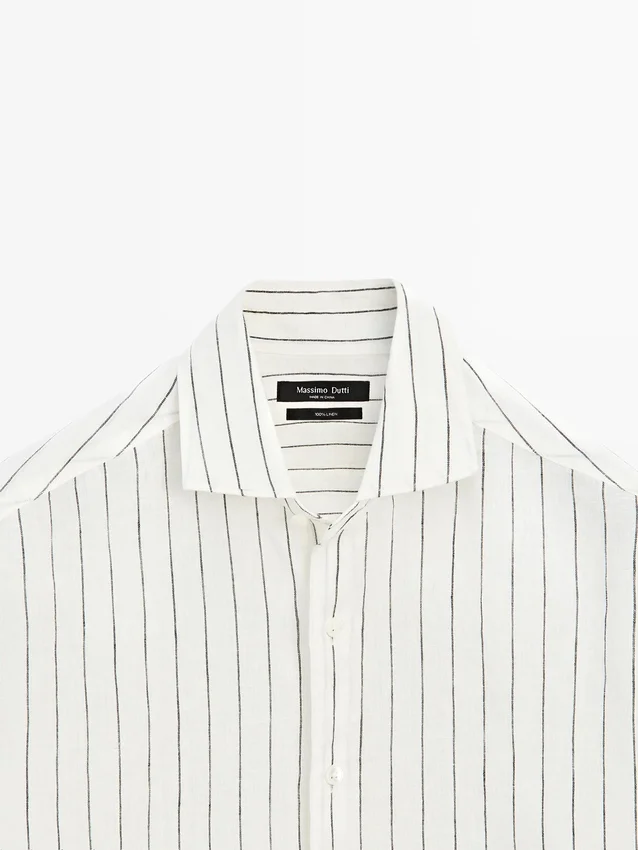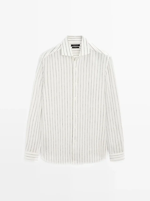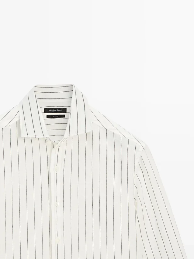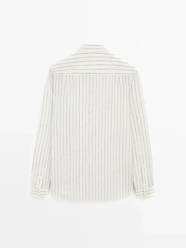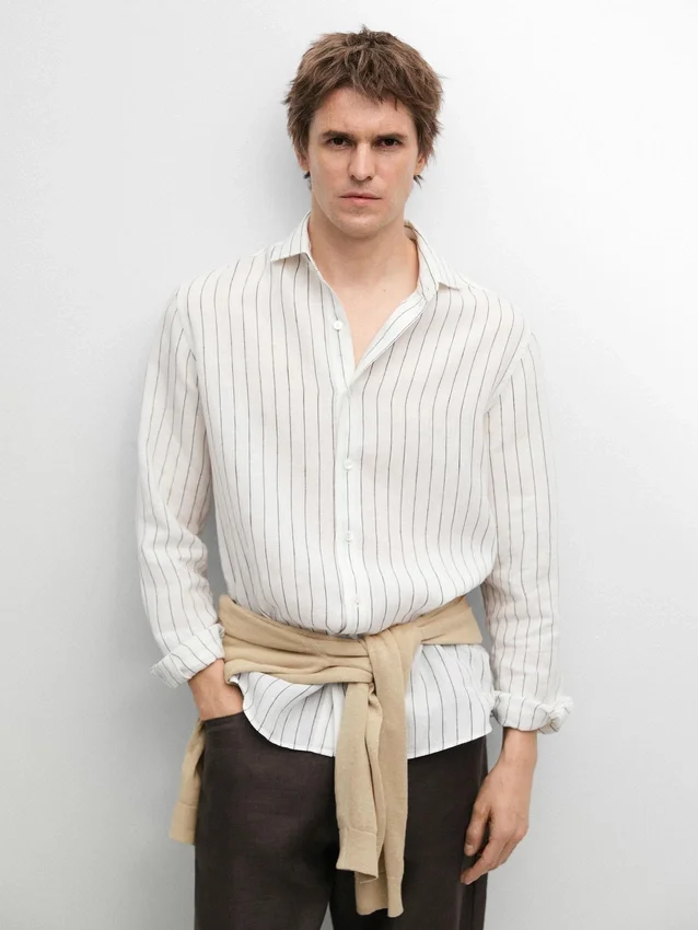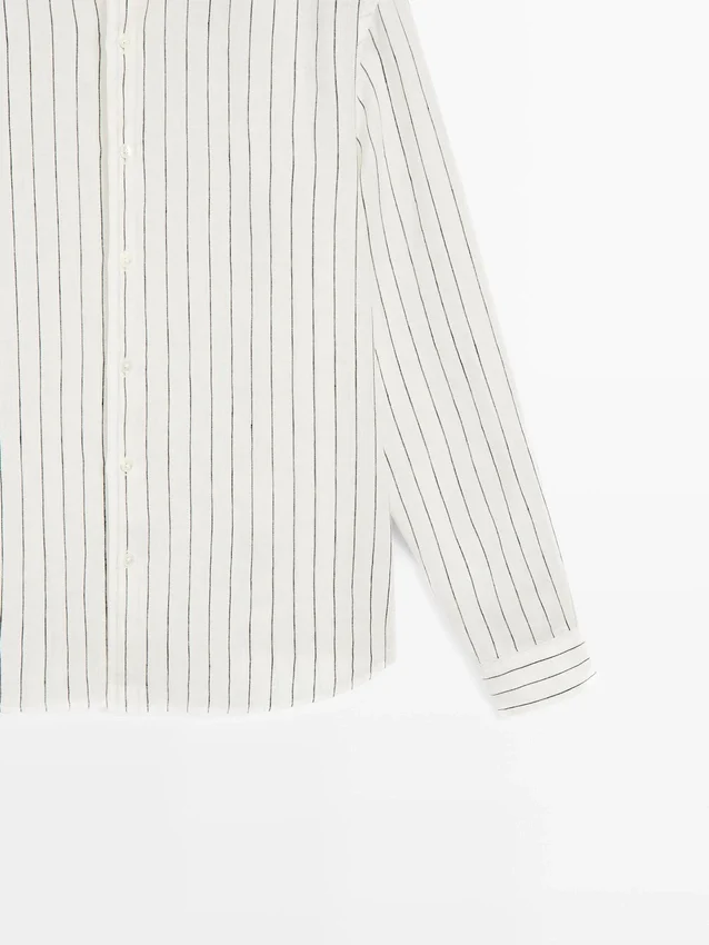 Långa ärmar med knäppta manschetter. Skjortkrage. Knäppning fram. Randigt mönster. Tillverkad av 100 % linne. Extra tunt tyg.