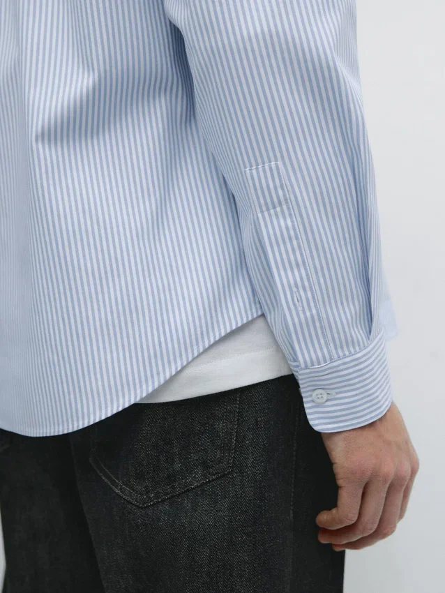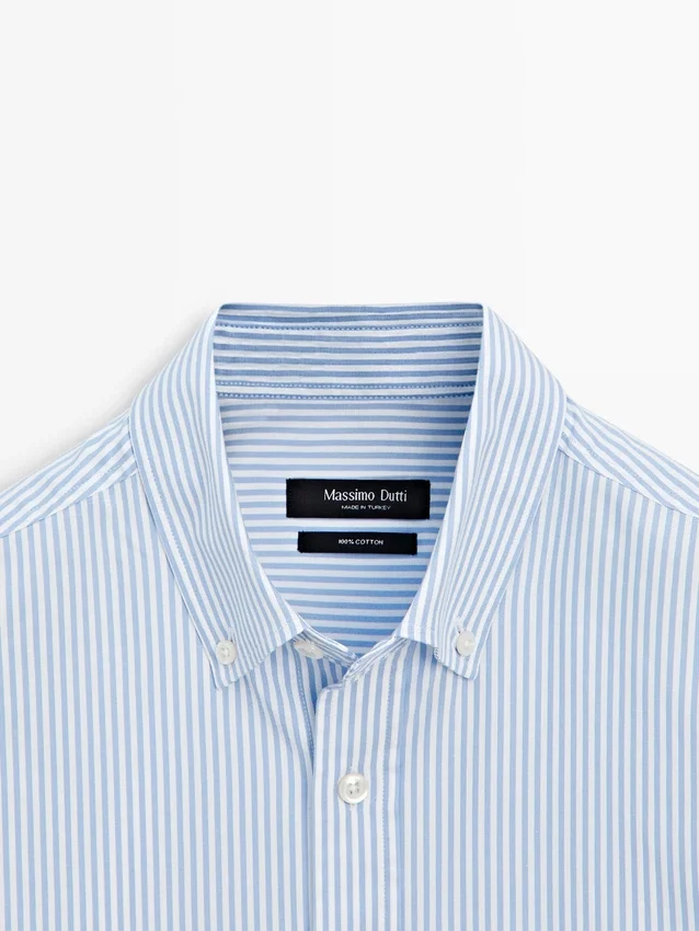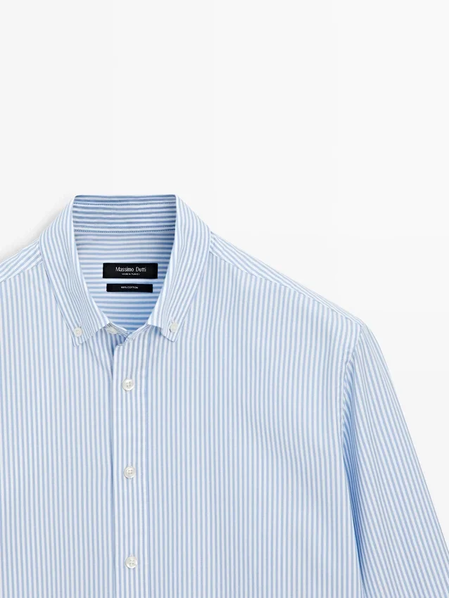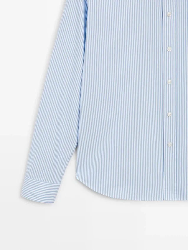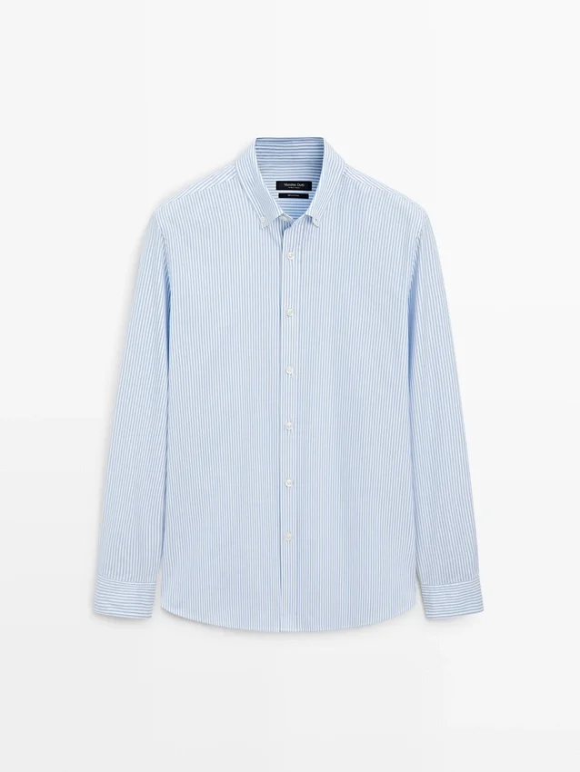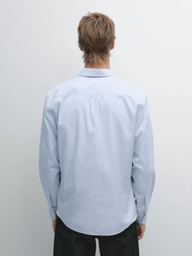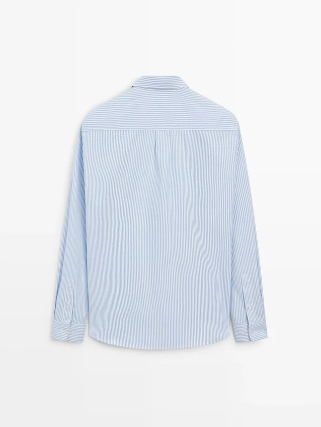 Skjorta tillverkad av 100 % bomullstyg. Långa ärmar med knäppta manschetter. Skjortkrage. Knäppning fram. Knappdetalj på kragen. Randigt tryck. Oxfordtyg.