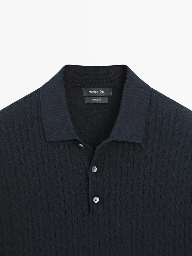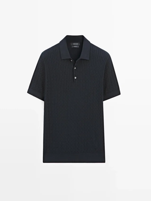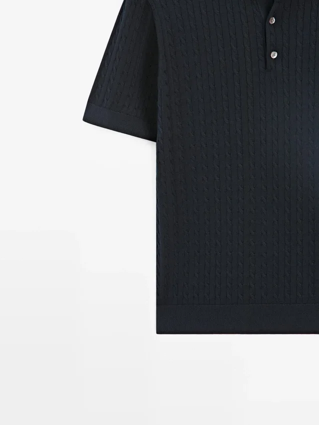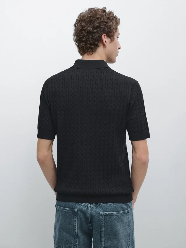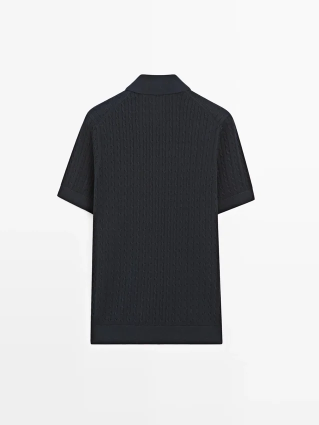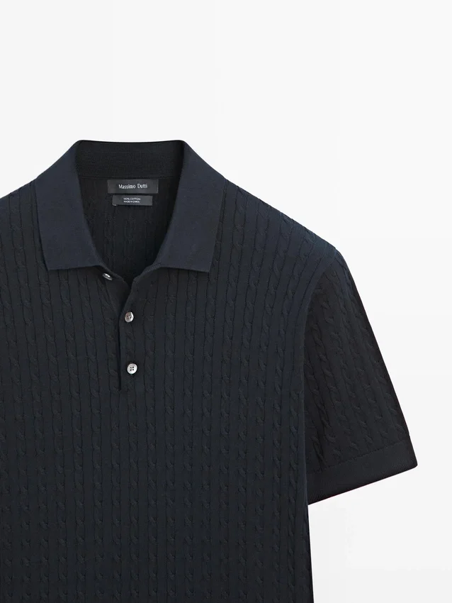 Pikétröja tillverkad av 100 % bomullstrikå. Korta ärmar. Polokrage med knäppning. Flätad detalj.