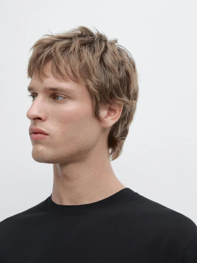 T-shirt tillverkad av bomullstrikå. Rund hals. Korta ärmar. Ribbade kanter. Fint, lätt tyg.