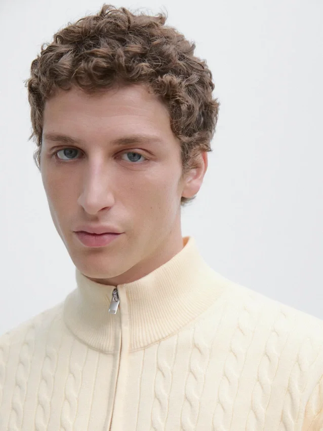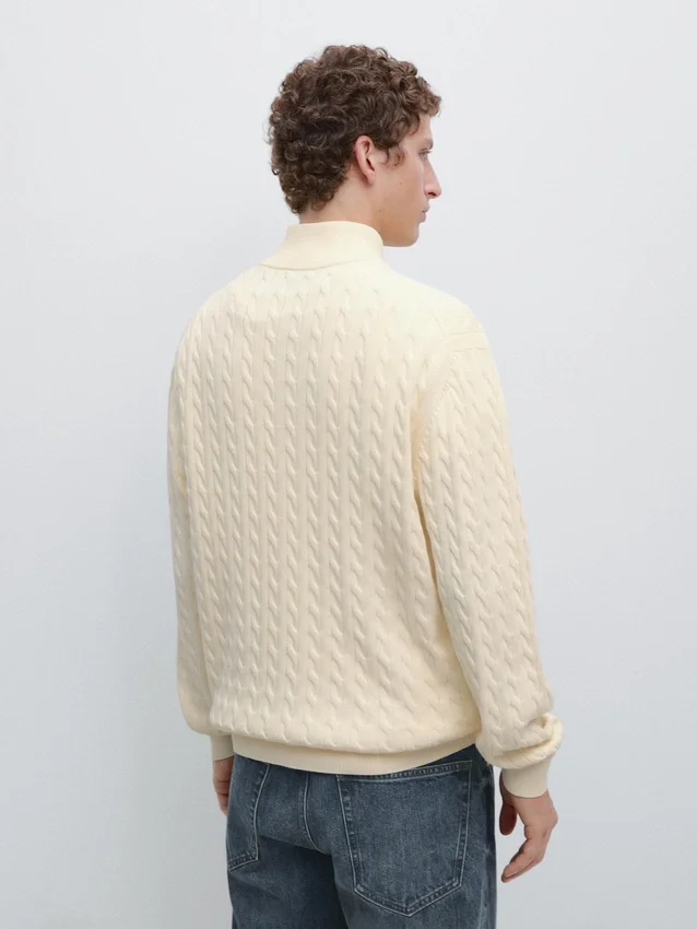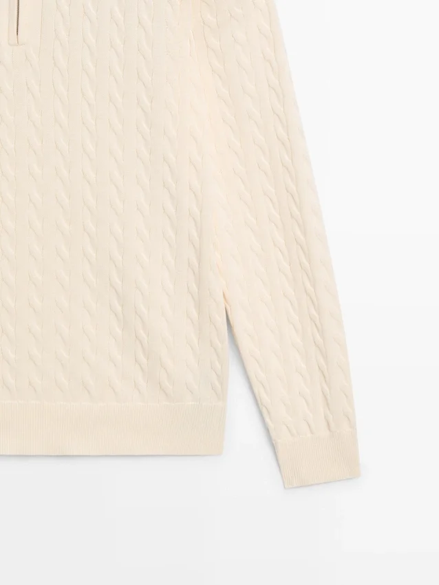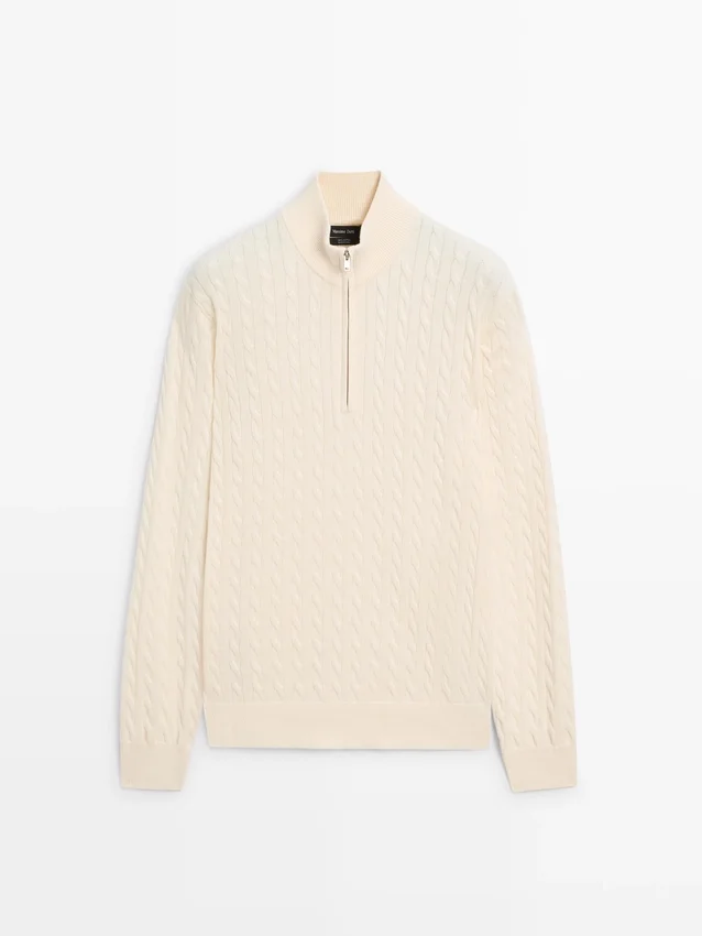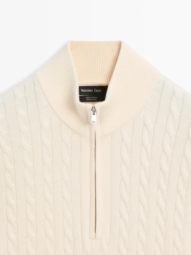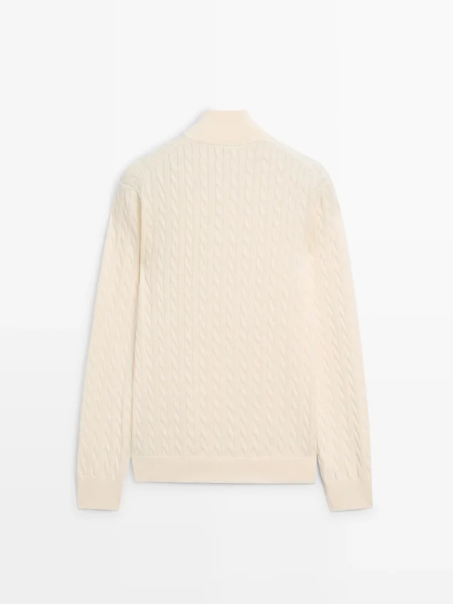 Stickad tröja i bomullstyg. Långa ärmar. Ståkrage med dragkedja. Ribbade kanter. Flätade detaljer.