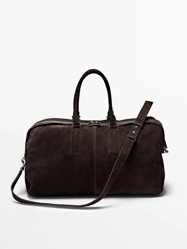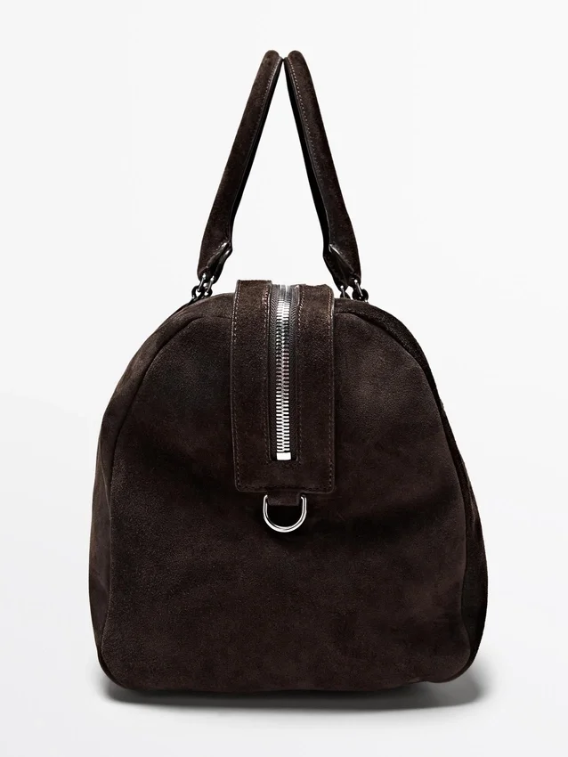 Handväska tillverkad av nötläder med mockafinish. Justerbar och avtagbar axelrem. Den har tvåvägsdragkedja. Handledsrem. Innerficka med dragkedja. Bomullsfoder.