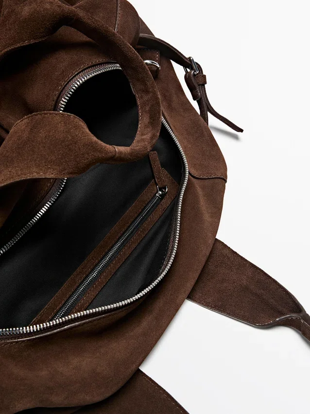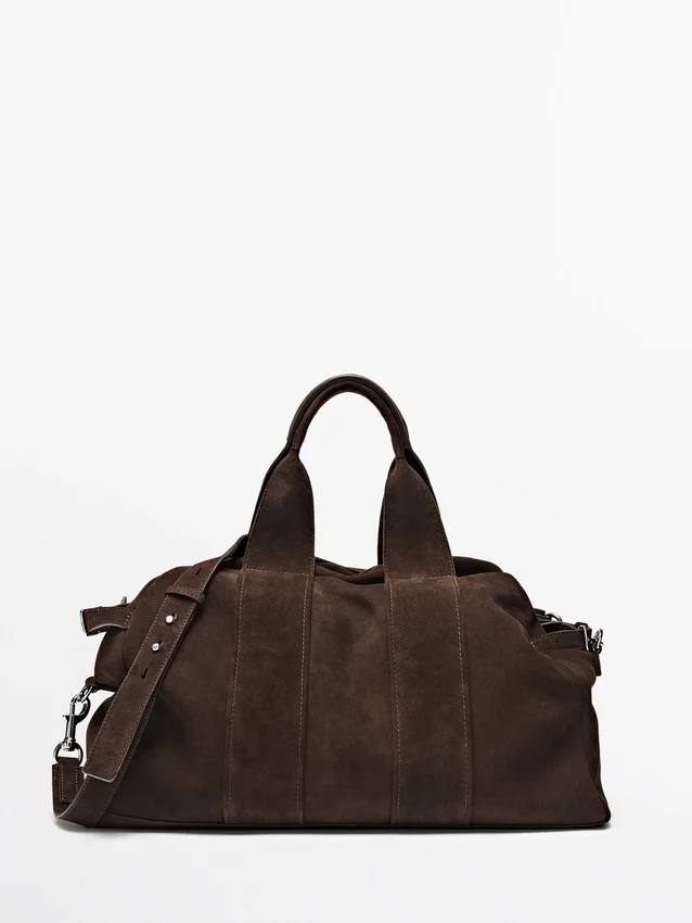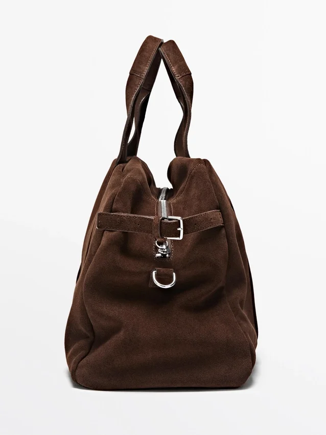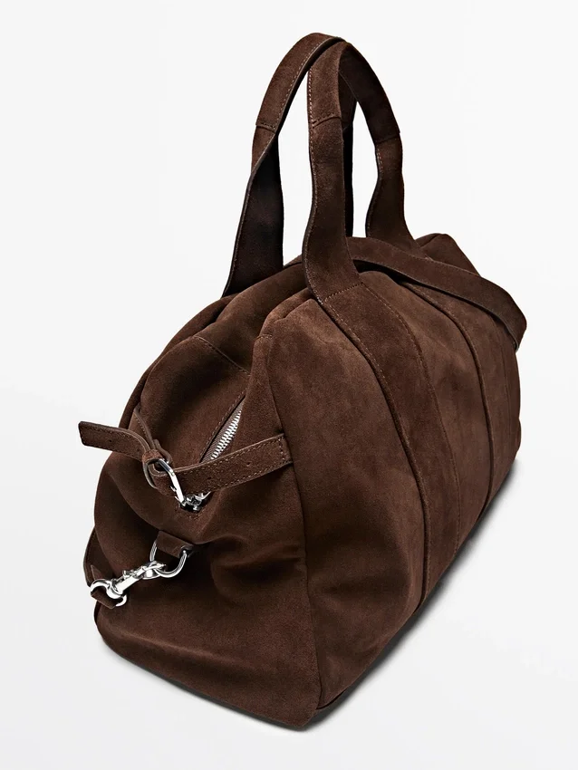 Handväska tillverkad av nötläder med mockafinish. Dragkedja. Två handtag och axelremmar. Bomullsfoder.